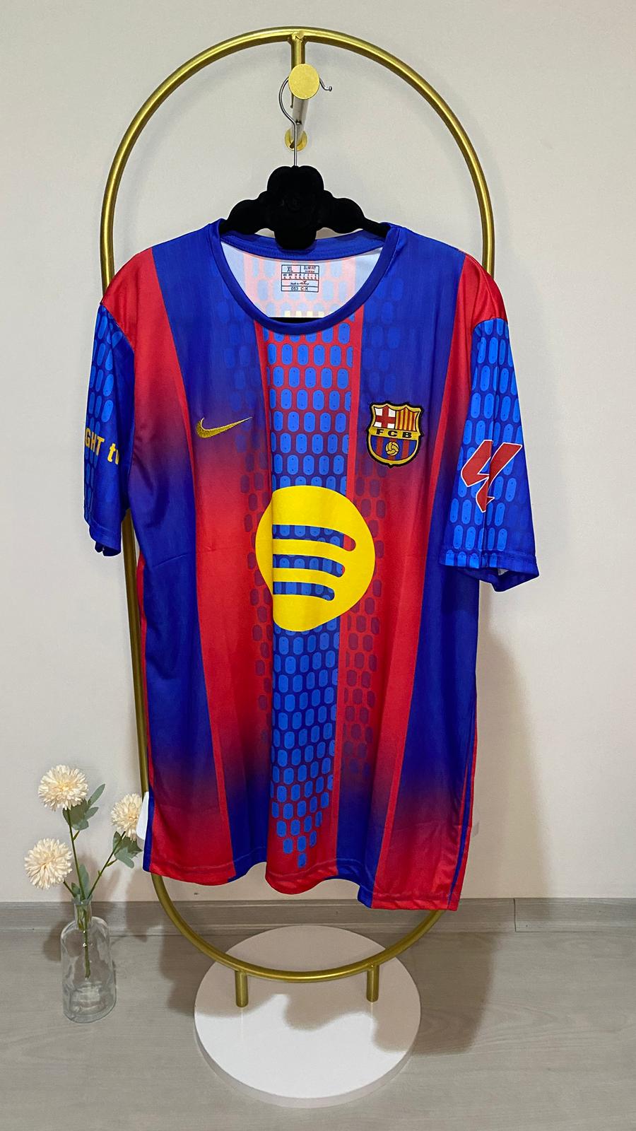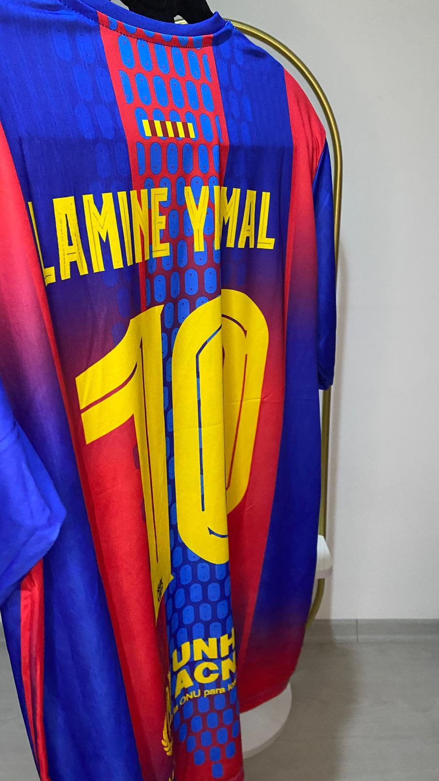 Formanın yaka kısmındaki ince detaylar, genel tasarımın estetiğini tamamlar. Takım logosu, formanın sol tarafında gururla taşınırken, arka kısımda Lamine Yamal’ın ismi ve numarası belirgin bir şekilde yer alır. Her taraftar için bir kimlik simgesi haline gelen bu forma, aynı zamanda koleksiyonluk değerine de sahiptir.
