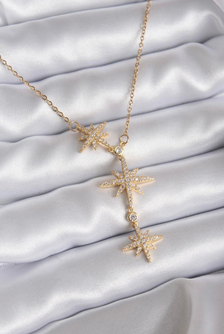 Bu kolye, Kuzey Yıldızı temasının zarif bir yansımasıdır. Sallantılı tasarımı sayesinde, takıldığında boyun çevresinde zarif bir hareketlilik yaratır. Zirkon taşları, ışık altında parlayarak kolyenin genel estetiğine katkıda bulunur ve kombinlerinize sofistike bir dokunuş katar.