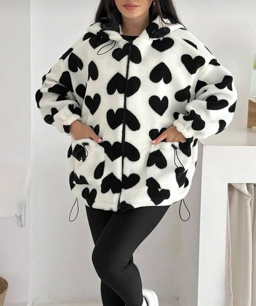 Kadın Oversize Kalp Desenli Polar Mont - Beyaz