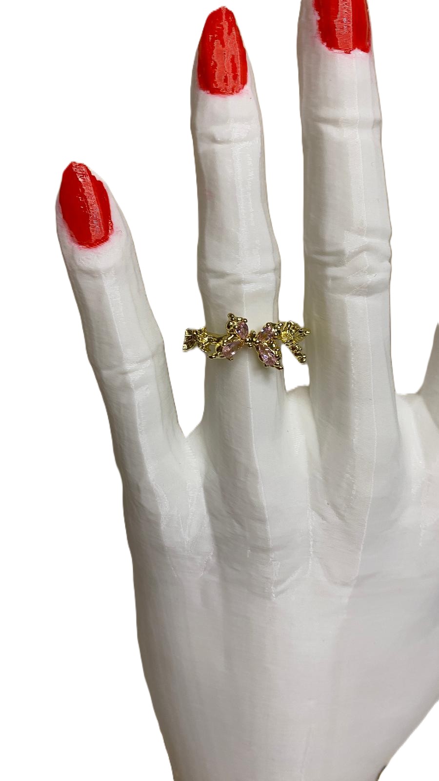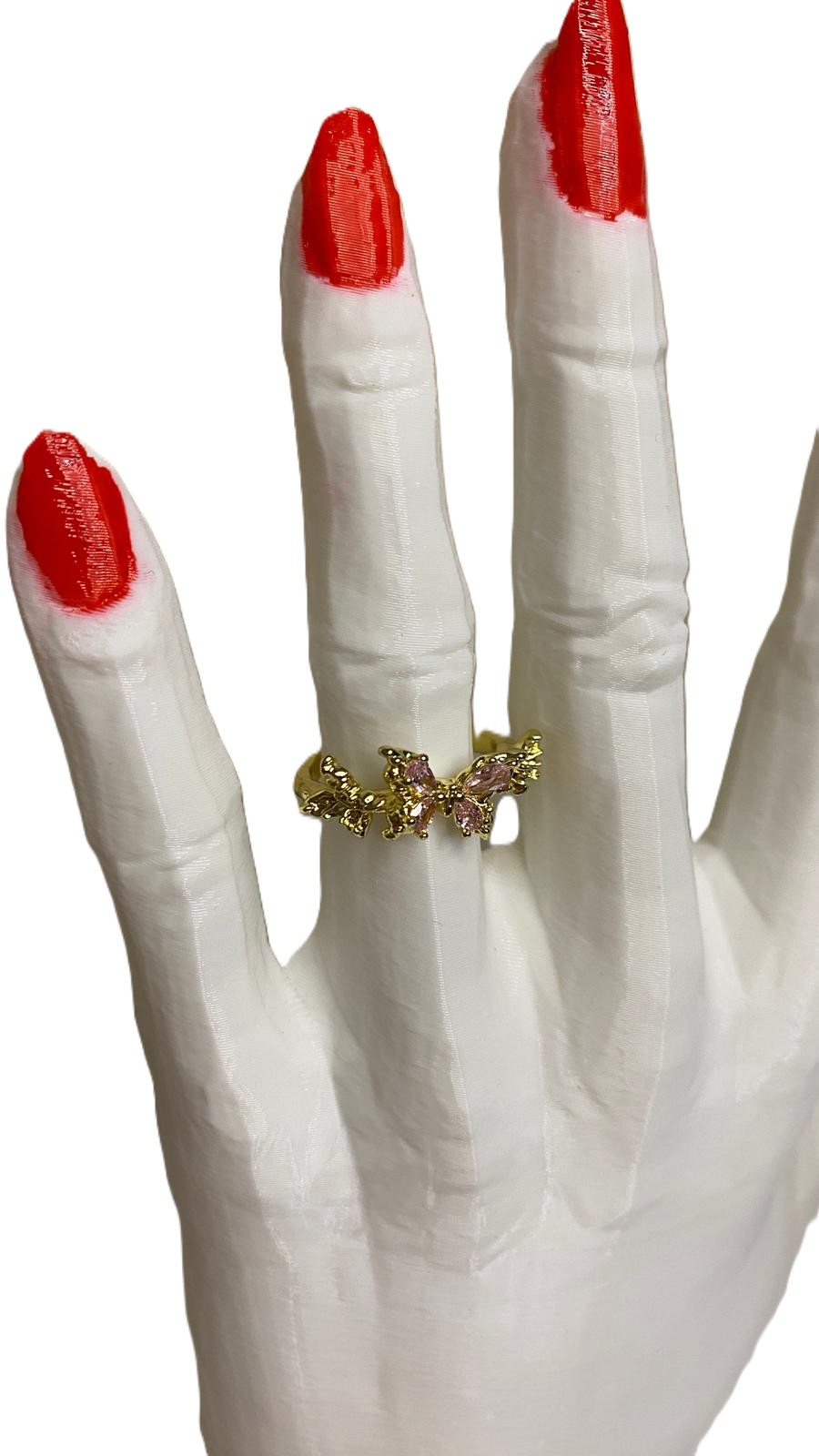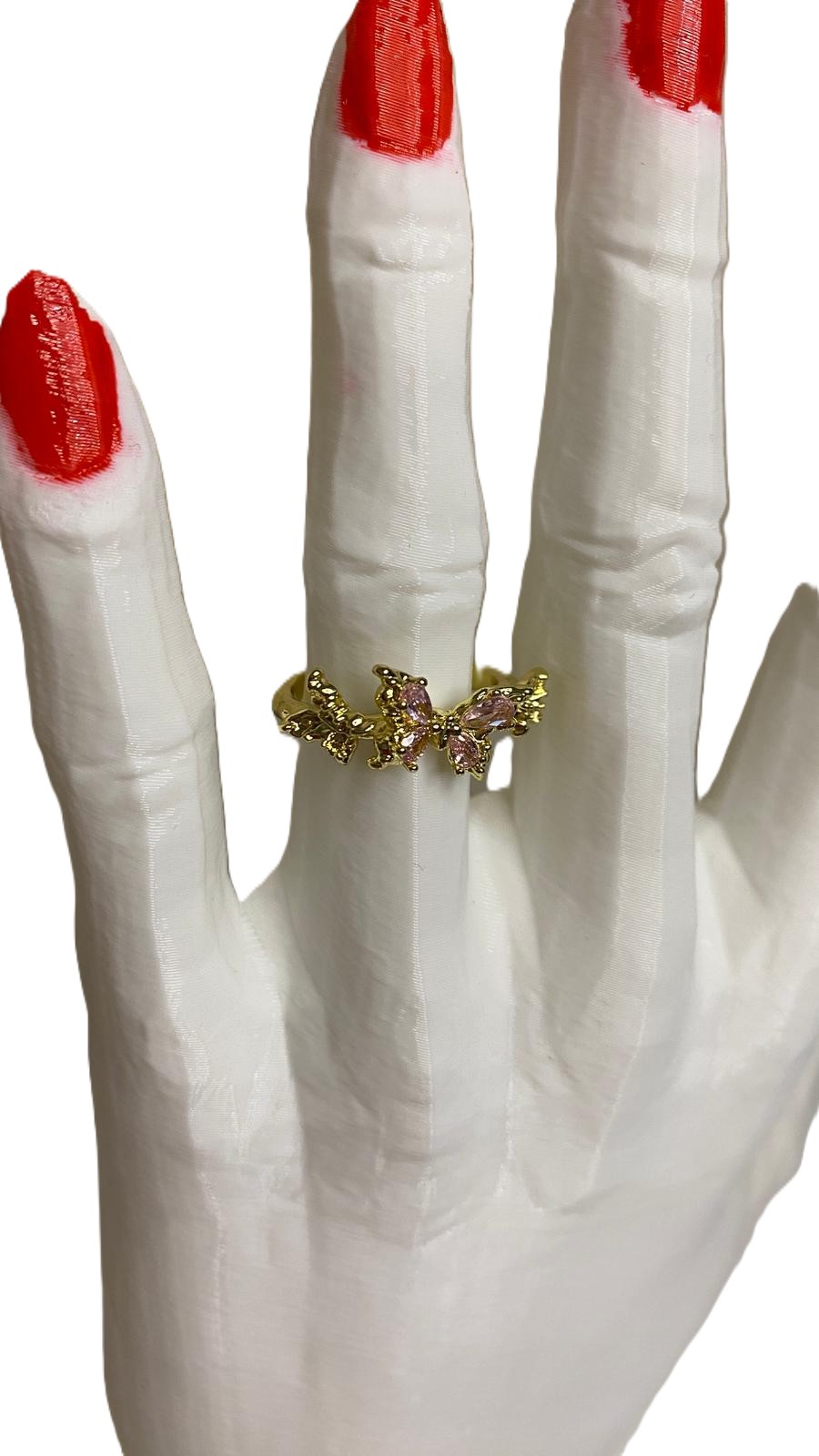KELEBEK DETAYLI PEMBE SİLVER VE ZİRKON TAŞLI ÇELİK GOLD TASARIM AYARLAMALI YÜZÜK