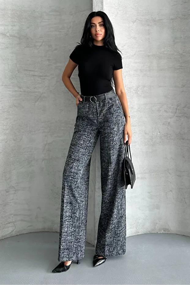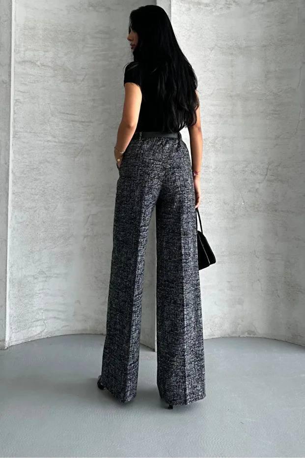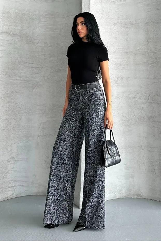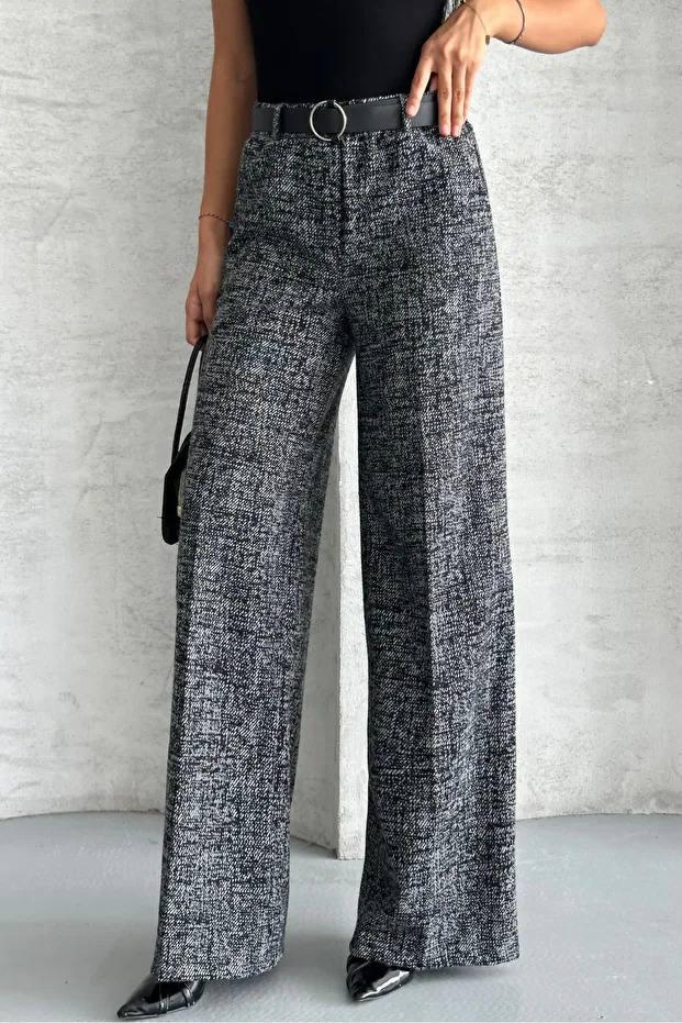 Yüksek Bel Lastikli Bedenli Bel Kemer Detaylı Cepli Kırçıllı Desenli Geniş Paça Yünlü Pantolon