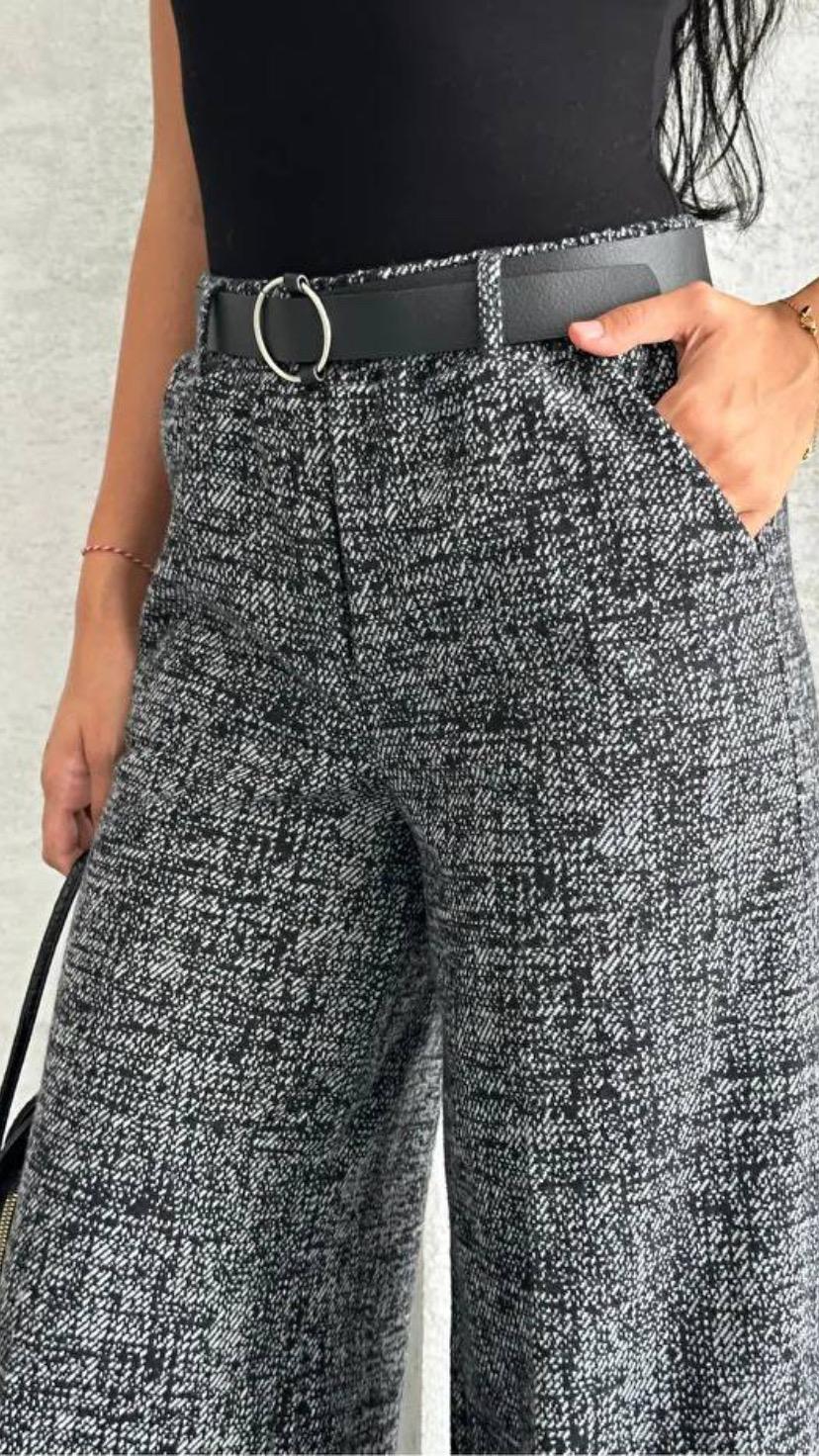 Yüksek Bel Lastikli Bedenli Bel Kemer Detaylı Cepli Kırçıllı Desenli Geniş Paça Yünlü Pantolon, hem şıklığı hem de konforu bir arada arayan kadınlar için mükemmel bir tercihtir. Moda dünyasında kendinize özgü bir stil yaratırken, aynı zamanda konforunuzdan ödün vermek istemiyorsanız bu pantolonu dolabınıza eklemeyi unutmayın.